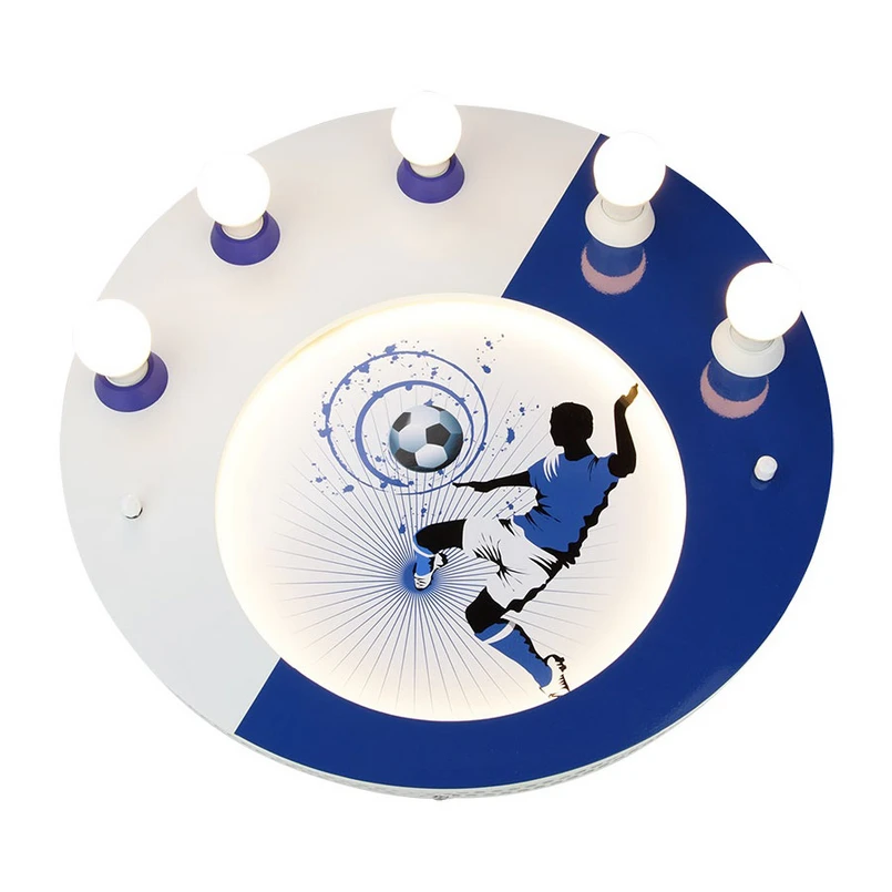 Die Deckenleuchte Soccer ist die ideale Beleuchtung für große und kleine Fußballbegeisterte. Ringsum sind fünf Leuchtmittel einzusetzen und das Motiv kann gleichzeitig oder separat geschaltet von verbauten LEDs beleuchtet werden. Diese Serienschaltung kann per Stromstoß über einen regulären Wandschalter bedient werden und ermöglicht unterschiedliche Lichtszenarien. Sind ausschließlich die LEDs aktiviert, dienen diese als Nachtlicht.