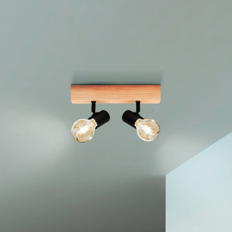 Die Lampe wird mit einem balkenförmigen Element aus Holz befestigt. Davon ragen zwei schwarze Fassungen aus Stahl ab, die in verschiedene Richtungen ausgerichtet sind. Die freiliegenden Leuchtmittel werfen so ungehindert ihr Licht in den Raum. Durch die moderne Farbkombination aus Braun und Holz und die robusten Materialien fügt sich die Lampe in verschiedene Einrichtungen.