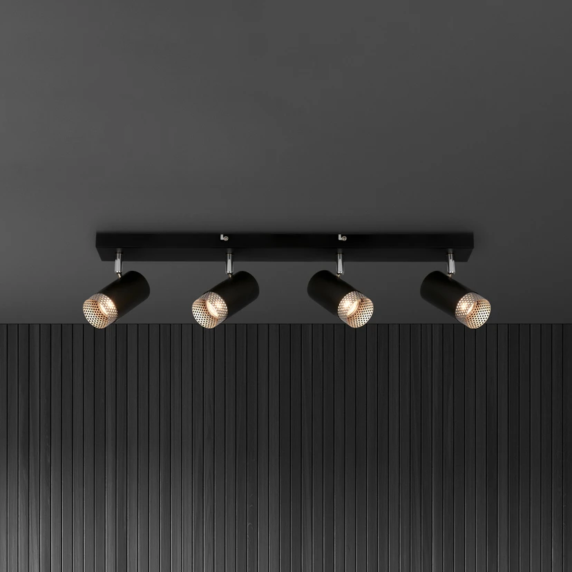 Absolut modern präsentiert sich der Deckenspot Plek mit der Kombination aus schlichtem Schwarz, kurzen Auslegern in Chrom und Aufsätzen an den Lichtaustritten in mattem Silber, die mit ihrem Lochmuster nicht nur die Optik des Deckenstrahlers, sondern auch die Lichtwirkung beeinflussen. Die vier zylindrischen Köpfe sind zudem dreh- und schwenkbar, sodass der Anbauspot Plek perfekt auf die jeweiligen Gegebenheiten angepasst werden kann.