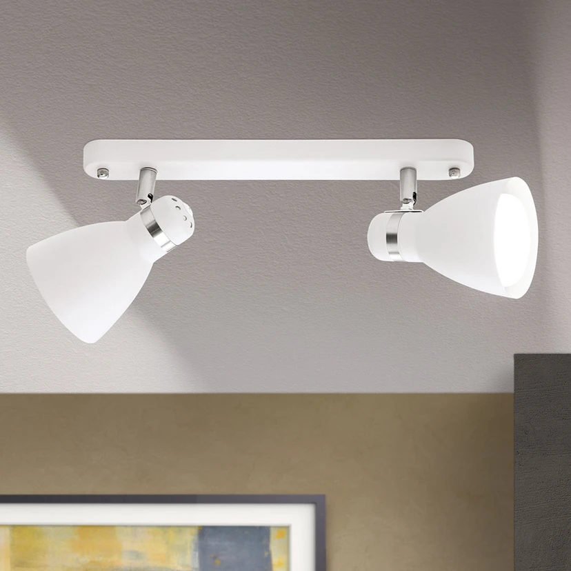 Die moderne Optik macht den zweiflammigen Deckenstrahler School zu einem unverzichtbaren Lichtobjekt für zeitgemäß gestaltete Wohnräume und Flure. Er besteht aus lackiertem Stahl, die beiden Leuchtenköpfe können gedreht werden und ermöglichen so eine individuell bestimmbare Lichtausrichtung. So wird nicht nur eine adäquate Allgemeinbeleuchtung geschaffen, sondern es können auch dunkle Raumwinkel angemessen erhellt werden. Die Optik wird noch durch je einen verchromten Ring im Fassungsbereich aufgelockert.