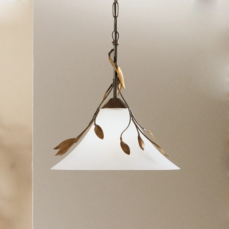 Dekorative Pendelleuchte CAMPANA mit Blattdekor und weißem Glasschirm