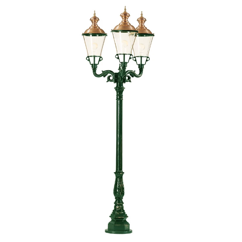 Der Kandelaber Parijs besticht durch ein sehr altertümliches und detailreiches Design. Dabei wurde durch den Einsatz von kleinen Schwüngen in der Halterung ein sehr altertümliches Aussehen geschaffen, das stark an alte Straßenlaternen erinnert. Die großen Gläser aus Acrylglas tragen auch zu diesem Eindruck bei und werden darüber hinaus noch sehr elegant von den Kupferdächern abgerundet. Darüber hinaus lassen sie eine großflächige Beleuchtung zu, die sich besonders im Gartenbereich gut einbringen lässt. Dabei ist die Leuchte in schwarz oder grün erhältlich und lässt sich gut ans umgebende Ambiente anpassen.