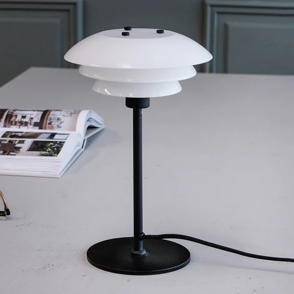 Opalglas-Tischleuchte DL20 mit dreiteiligem Schirm Der besondere Schirm der Tischleuchte DL20 setzt sich aus drei einzelnen Schirmelementen in unterschiedlichen Größen zusammen. Von klein nach groß wurden diese mit ein wenig Abstand übereinander montiert. Dies bewirkt eine ganz besondere Lichtabgabe, nicht nur nach unten, sondern auch zur Seite - und das ohne Blendungen. Die Leuchtenserie DL20 stammt von dem dänischen Leuchtenhersteller Dyberg Larsen. Die Tischleuchte entfaltet sowohl auf einem Möbelstück im Wohnzimmer als auch auf dem Nachttisch im Schlafzimmer ihre schöne Wirkung.