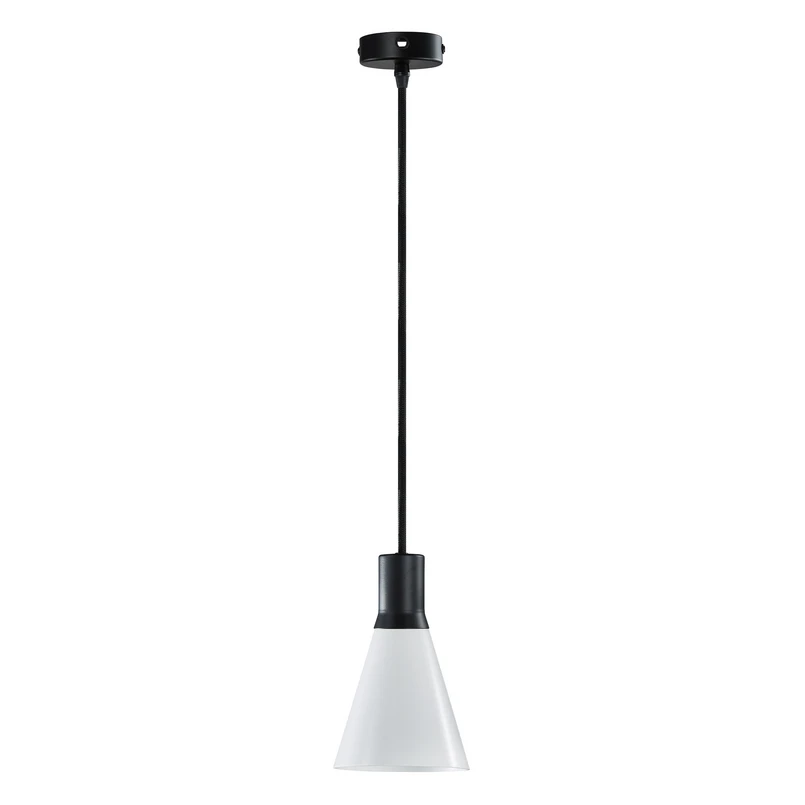 Der Schirm der Pendelleuchte Gent ist klein, aber fein: Er besteht aus opalweißem Glas, das konisch geformt ist. Die Aufhängung ist aus mattschwarzem Metall, das in das textilummantelte Kabel übergeht. Gent kann sowohl einzeln als auch zu mehreren in einer Gruppe oder Reihe aufgehängt werden, z. B. über einem Tresen oder einem Esszimmertisch.