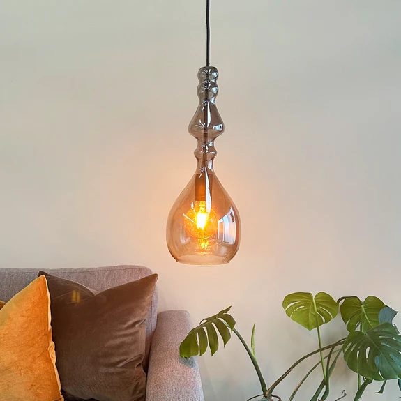 Die Hängeleuchte Lea besticht auf vielerlei Art: Zum einen ist ihr Schirm aus mundgeblasenem Glas in sehr dekorativer Form gestaltet, zum anderen verleiht die Farbgebung der Optik sowie der Lichtabgabe besonderes Flair. Das Licht der eingesetzten Lampe wird rundherum abgestrahlt und sorgt im Zusammenspiel mit der Glastönung für ein behagliches Ambiente.
