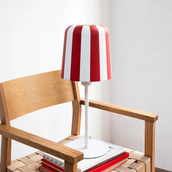 Jahrmarktaccessoires wie u. a. bunte Karussells, Lutscher und gestreifte Pavillons waren die Idee hinter Gry Fagers Lampendesign. Die dänische Designerin, die sich oft von Mustern und Drucken aus der Welt der Textilien inspirieren lässt, wollte eine fröhliche Lampe entwerfen. Eine Leuchte, die die Menschen zum Lächeln bringt und ihnen ein visuelles Erlebnis bietet, indem sie erkennbare Muster in einen neuen Kontext setzt. Die Vision wurde Wirklichkeit und Gry realisierte eine Serie, die aus einer Tischlampe und einer Pendelleuchte besteht. Die aus weißem Metall mit farbigen Streifen gefertigten Lampen sind mit einer passenden weißen Stoffkordel versehen und haben ein raffiniertes Messingdetail an der Oberseite.