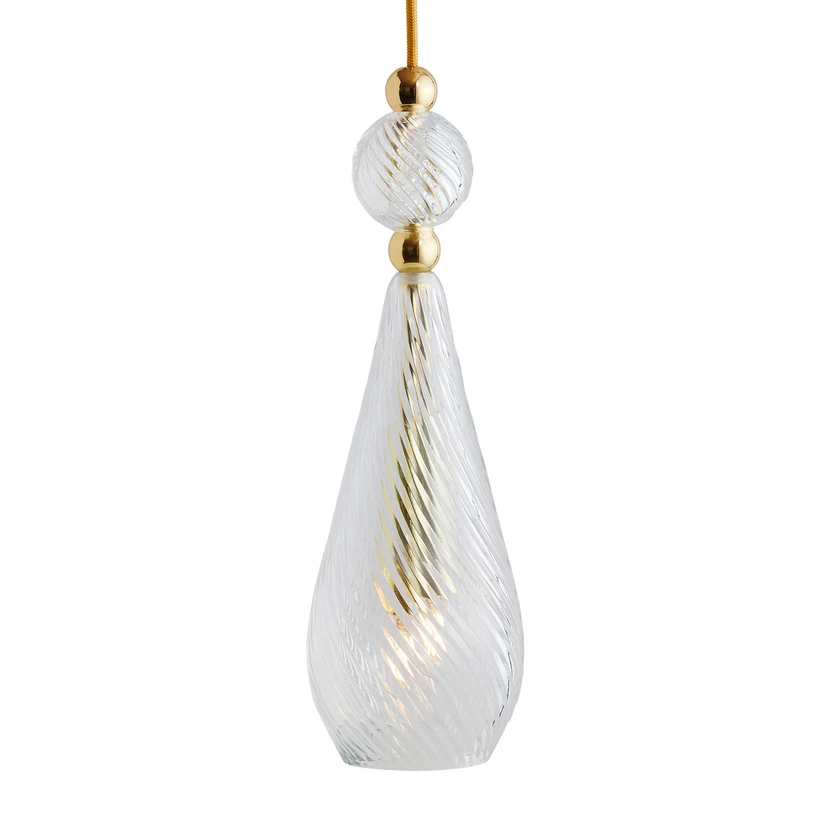 Einen Hauch von Luxus verleiht die Pendelleuchte Smykke mit dem formschönen Schirm aus klarem Kristallglas jedem Ambiente, sei es noch ausgeschaltet durch das fabelhafte Design, sei es beleuchtet durch die Schönheit der Lichtwirkung, die dadurch vergrößert wird, dass der weit in das Glas reichende Abhängungsstab mit der Fassung und somit auch die verwendete Lampe von allen Seiten sichtbar bleibt. Über dem Schirm ist als Zierde eine kleine Metallkugel befestigt, darauf folgt eine wiederum etwas größere Kugel aus Kristallglas und als Abschluss wieder eine kleine Metallkugel.