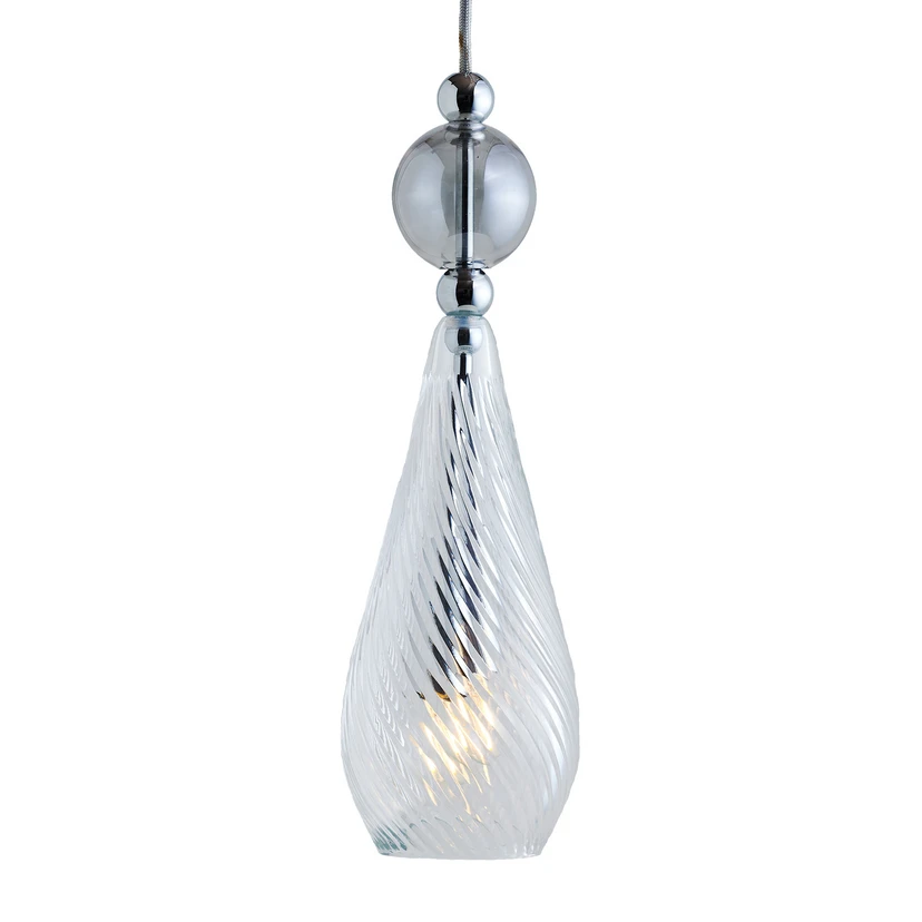Ein faszinierendes Lichtbild offenbart die Hängeleuchte Smykke, die sich besonders gut für die stimmungsvolle Tischbeleuchtung in Wohn- und Esszimmern eignet. Bis weit in den Schirm hinein reicht das stabartige Abhängungselement aus silberfarbenem Metall, in das am unteren Ende die Fassung für das Leuchtmittel (nicht enthalten) integriert ist. Das Licht der eingesetzten Lampe setzt den Kristallglasschirm wundervoll in Szene und bewirkt einzigartige Reflexionen. Über dem Kristallglasschirm ist eine kleine silberfarbene Metallkugel befestigt, darüber eine größere Kugel aus mundgeblasenem Glas und ganz oben wiederum eine kleine Metallkugel in Silber.
