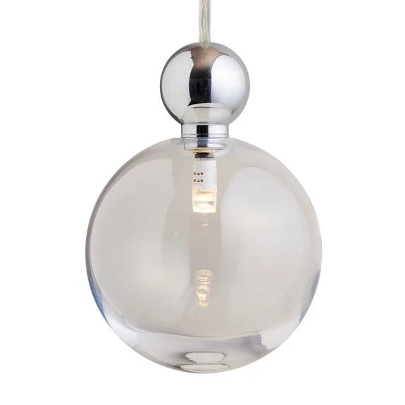 Wer ein Leuchtenaccessoire moderner Eleganz, das sich für vielfältige Beleuchtungsaufgaben anbietet, in seine Einrichtung integrieren möchte, für den ist die Hängeleuchte Uva aus dem Hause EBB & FLOW die optimale Wahl. An einem sehr unauffälligen, transparenten Abhängungskabel aus Kunststoff hängt ein Kugelschirm aus mundgeblasenem Glas herab, dessen Oberseite noch mit einer silberfarbenen Metallkugel verziert ist.