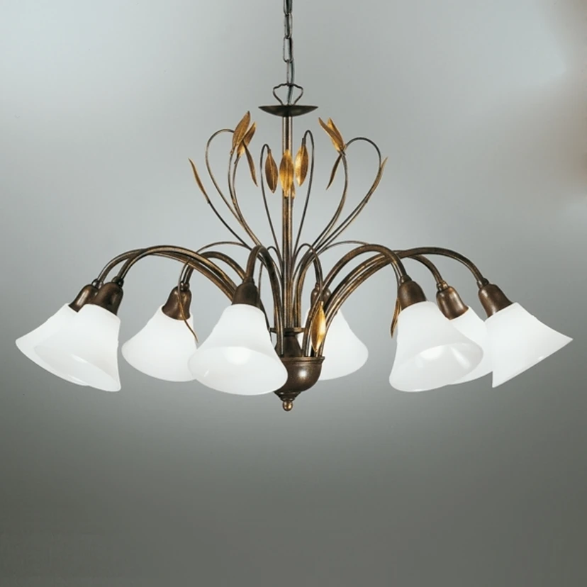 Deutsches und italienisches Design sowie hohe Handwerkskunst treffen bei der Campana Hängeleuchte aufeinander. Viel hochwertige Handarbeit war an der Fertigung der acht kelchförmigen Leuchtenschirme beteiligt. Das weiße Opalglas schillert besonders schön im Licht. Das Leuchtengestell wurde in einem rostbraunen Metall gehalten. Die Blattranken sind durch ihre goldene Patina überaus dekorativ. Die Campana Leuchte kann ihr Licht in nahezu alle Richtungen abstrahlen.