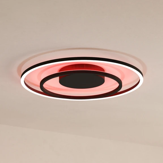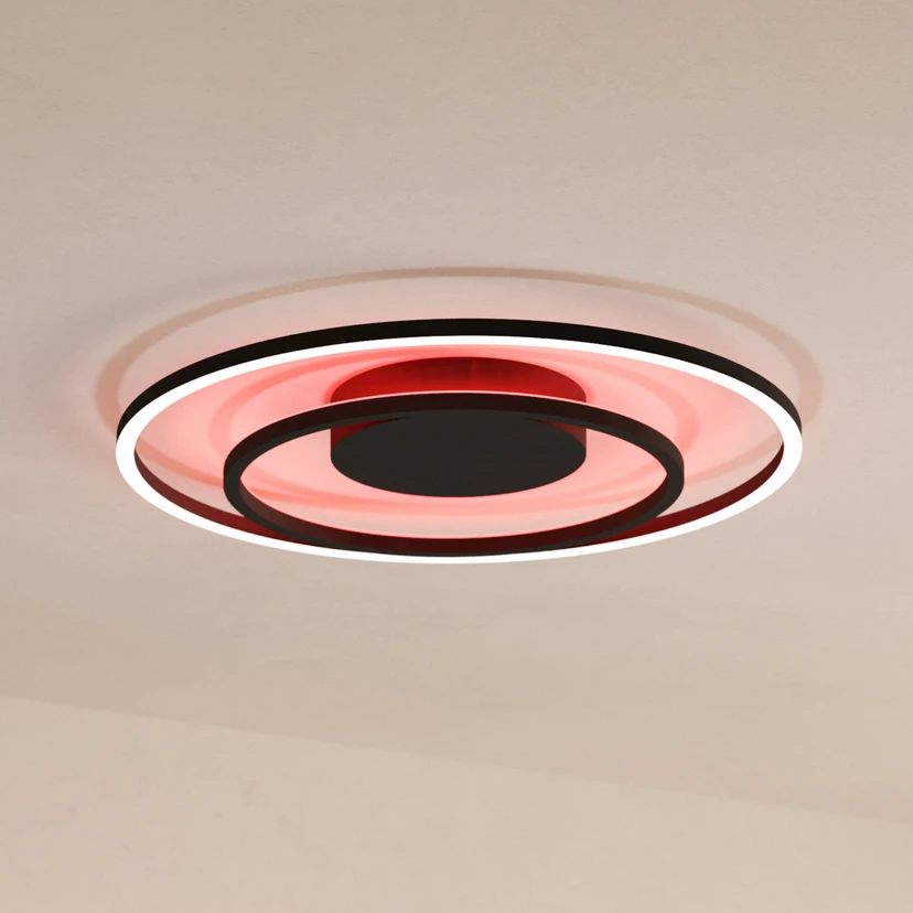 Die LED-Deckenleuchte Calagrano-Z überzeugt mit ihrer modernen Steuerungsmöglichkeit und dem klaren, schlichten Design. Sie setzt sich aus zwei schwarzen, runden Kreisen zusammen, die in sich verschlungen sind. Hinter der weißen, nach unten gerichteten Kunststoffabdeckung des äußeren Rings sind die LEDs verbaut, die zahlreiche Weißschattierungen abstrahlen können. Das nach oben gerichtete Licht des inneren Kreises kann in bunten Farben strahlen und separat geschaltet werden.
