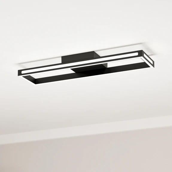 Die LED Deckenleuchte Savilanas-Z aus dem Smart Home Sortiment connect.Z ist aus einem rechteckigen, schwarzen Metall-Rahmen mit integrierten Leuchtelementen gefertigt. Dank des besonderen Designs strahlt das Licht nicht nur indirekt an der Außenseite des Metall-Rahmens, sondern auch direkt nach unten in den Raum. Die LEDs hinter den weißen Kunststoff-Abdeckungen spenden angenehmes Licht ganz nach Wunsch. Die Wahl zwischen warmweißem, universalweißem und tageslichtwißem Licht sowie die Dimmfunktion ermöglichen jederzeit die passende Beleuchtungseinstellung. Die Steuerung erfolgt via kostenloser App (AwoX Home Control) und ermöglicht den Zugriff auf weitere Komfortfunktionen wie Dimmen, Timer, Anwesenheitssimulation und vielen mehr. Die Ansteuerung der Leuchte erfolgt über Bluetooth sowie ZigBee 3.0 und ermöglicht zudem die Steuerung über kompatible Sprachassistenten. Alternativ lässt sich die smarte Deckenlampe auch über die separat erhältliche Fernbedienung steuern. Sie bietet eine moderne und stimmungsvolle Beleuchtung für jeden Raum – egal ob in der Küche, im Wohnzimmer, Schlafzimmer oder Flur.