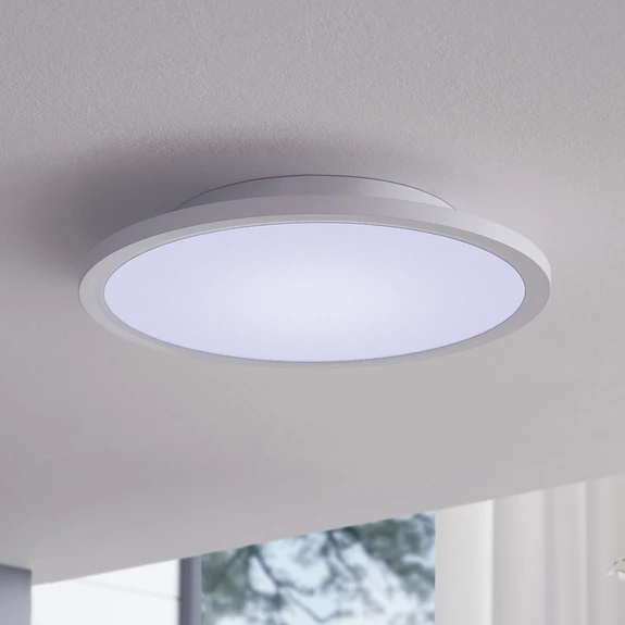 Ihre Vielseitigkeit und die Flexibilität der Steuerung machen die LED-Deckenleuchte Sarsina-C so einzigartig. Mit der beiliegenden Fernbedienung kann die Leuchte bequem vom Sofa aus geschaltet, gedimmt und in der Lichtfarbe geändert werden. Dabei kann Sarsina-C nicht nur die Farbtemperatur von warmweiß auf tageslicht ändern, sondern bietet auch farbige Beleuchtung aus einem Spektrum von fast 16 Millionen Farbtönen. So ist für jede Gelegenheit das richtige Ambiente erreichbar.