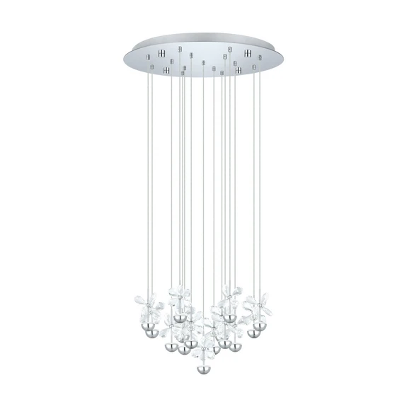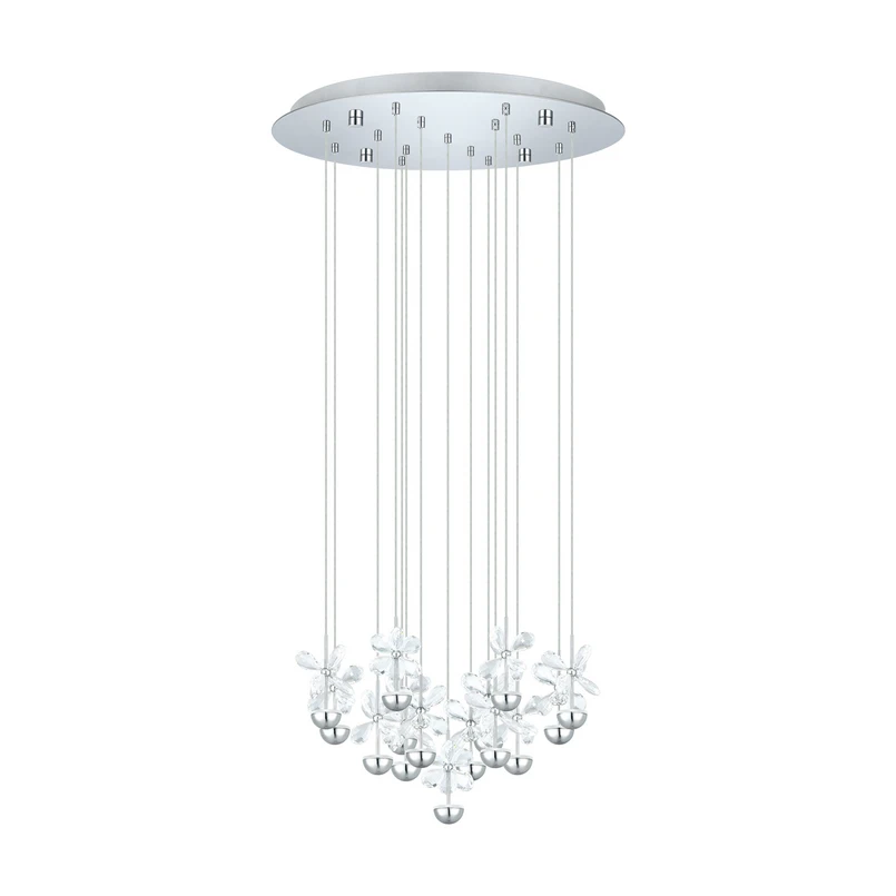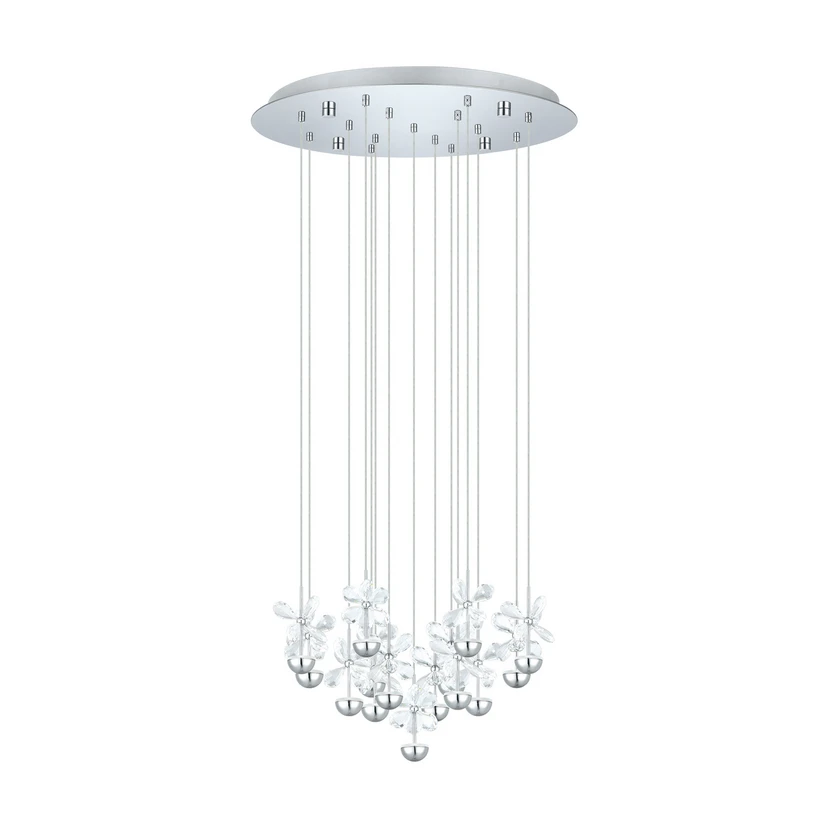Die runde LED-Hängeleuchte Pianopoli besticht durch eine faszinierende Lichtwirkung durch im Licht schillernde, klare Glaselemente mit Schliff, die an Blüten erinnern. Vom runden Baldachin hängen halbrunde Metallschalen ab, in denen warmweiße LEDs verbaut wurden. Diese geben ihr Licht nach oben ab und strahlen die unzähligen, darüber angebrachten Glaselemente an, so dass diese im Licht funkeln. Dieses besondere und extravagante Design macht die Hängeleuchte Pianopoli zum faszinierenden Lichtspender und zum Blickfang in einem Raum. Die Leuchte ist mit einem dimmbaren LED-Treiber und dimmbaren LEDs bestückt und kann über einen in der Rauminstallation vorhandenen Dimmer auch in der Helligkeit reguliert werden.