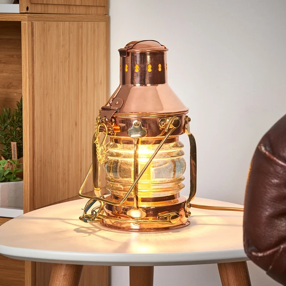 Die nostalgische Leuchte aus Metall und transparentem Glas erscheint in der Form einer alten Laterne. Die Farbe des Metalls ist hierbei in Messing und Kupfer gehalten. Betrieben wird die Dekorationsleuchte allerdings elektrisch mit einem Kabel und nicht mit einem Feuer. Im klaren Glas geht der rustikale Effekt aber nicht verloren.