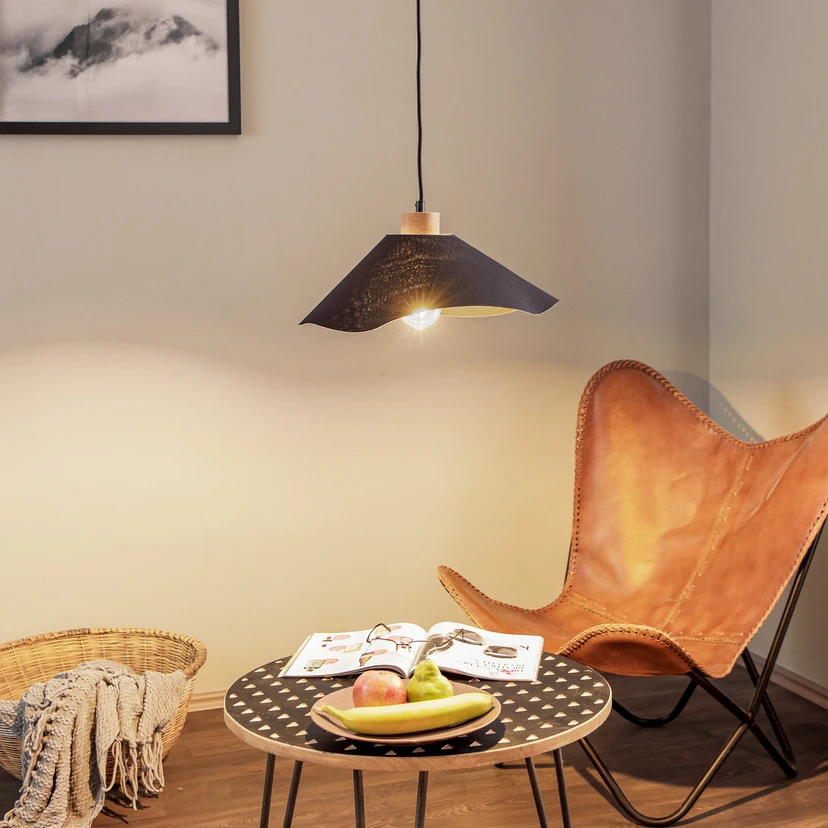 Schwarze Pendelleuchte Marian mit asymmetrischem Stoffschirm und hellen Holzdetails