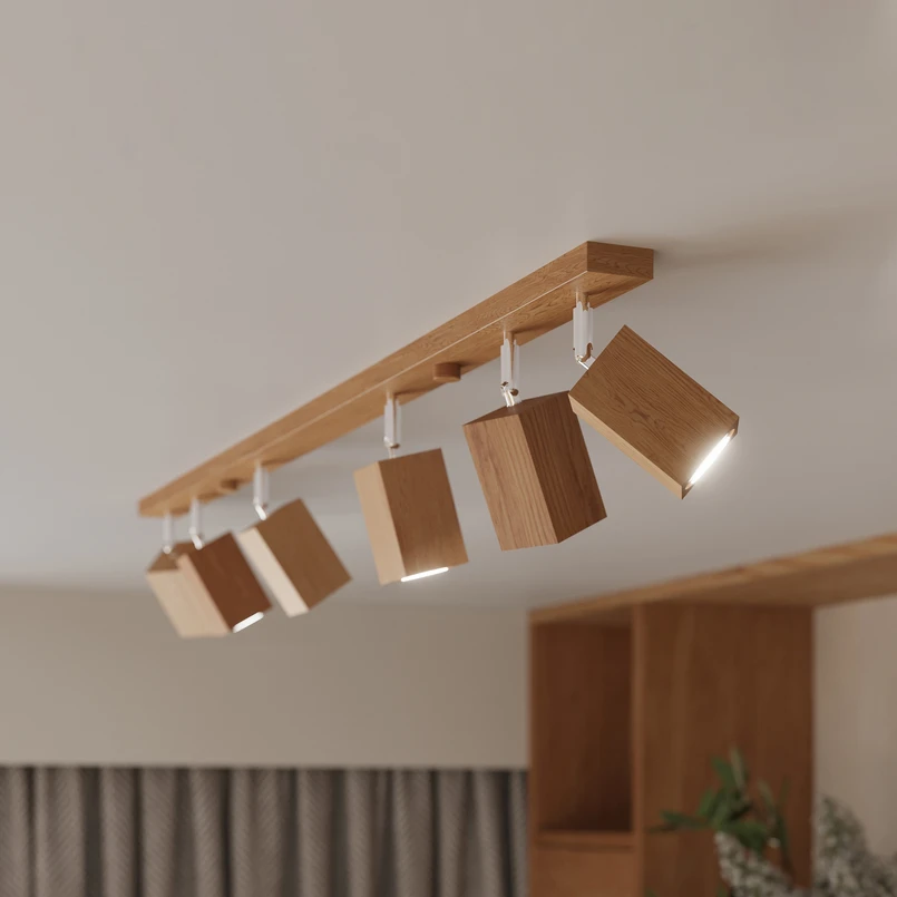 Sechsflammiger Deckenspot Peach Puff aus hellem Holz in Quaderform