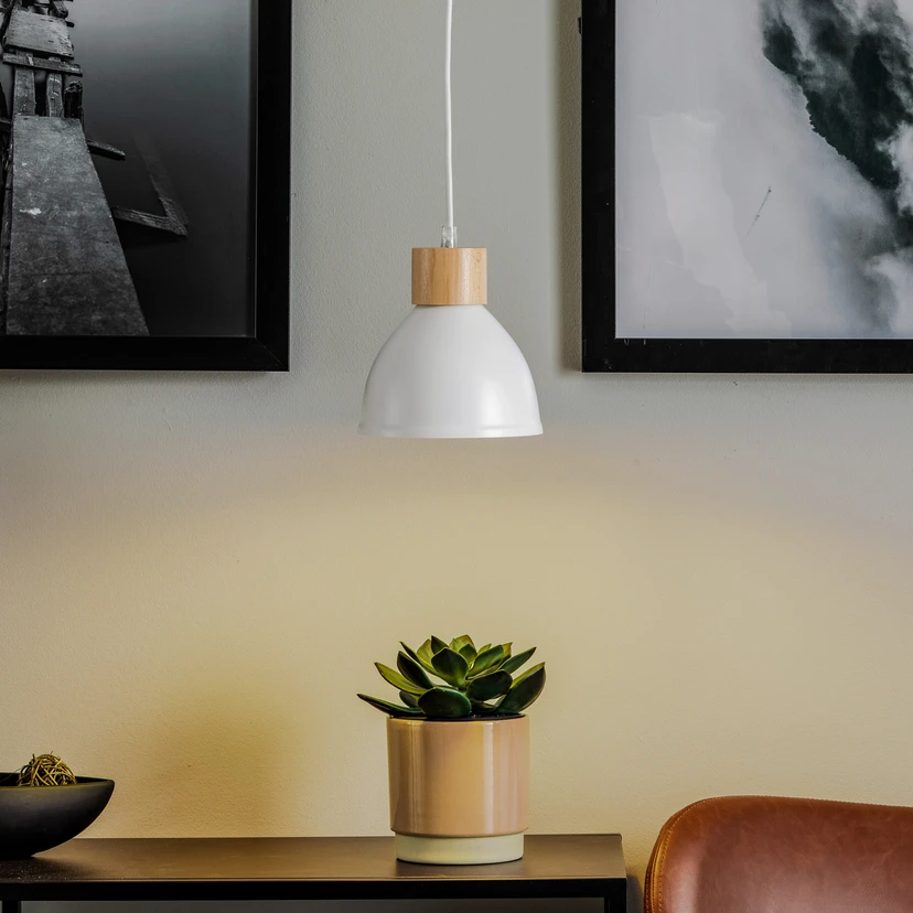 Einflammige Pendelleuchte Tira mit weißem, rundem Schirm und hellem Holzelement
