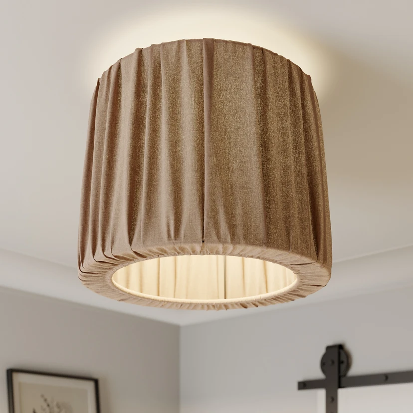 Die Farbe Cappuccino ist ein Braunton, welcher sich bei der Deckenleuchte Waltz mit dem lose gewellten Baumwollstoff perfekt zu einem wohnlichen, natürlichen und aktuellen Lichtspender ergänzt. Der Stoffschirm erhält durch eine innenliegende Metallstruktur seine Zylinderform und wird mit einem schwarzen, runden Baldachin an der Decke befestigt.