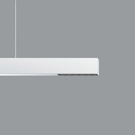 Ein schlankes, rechteckiges Aluminiumprofil in weißer Pulverbeschichtung bildet den Korpus der LED-Hängeleuchte Compar. Dieser beherbergt drei separate LED-Lichtquellen. An den Längsenden liegen zwei nach unten strahlende Brennstellen, deren Licht jeweils durch ein Linsensystem aus optischem Polymer und ein Abblendraster in breiter, ovaler Charakteristik ausgestrahlt wird und dank der geringen Blendwirkung die ideale Arbeitsbeleuchtung für moderne Büroräume bietet. Die nach oben strahlende Lichtquelle liegt unter einem Diffusor aus strukturiertem Kunststoff, der für eine besonders breite Lichtstreuung sorgt und so eine indirekte Grundbeleuchtung über die Decke für einen großen Bereich des Raums gewährt. Mit einer externen DALI-Steuerung kann der Lichtoutput geregelt werden (Dimmen/Schalten für Up- und Downlight unabhängig voneinander möglich).