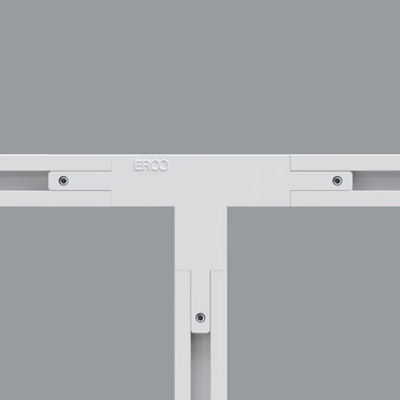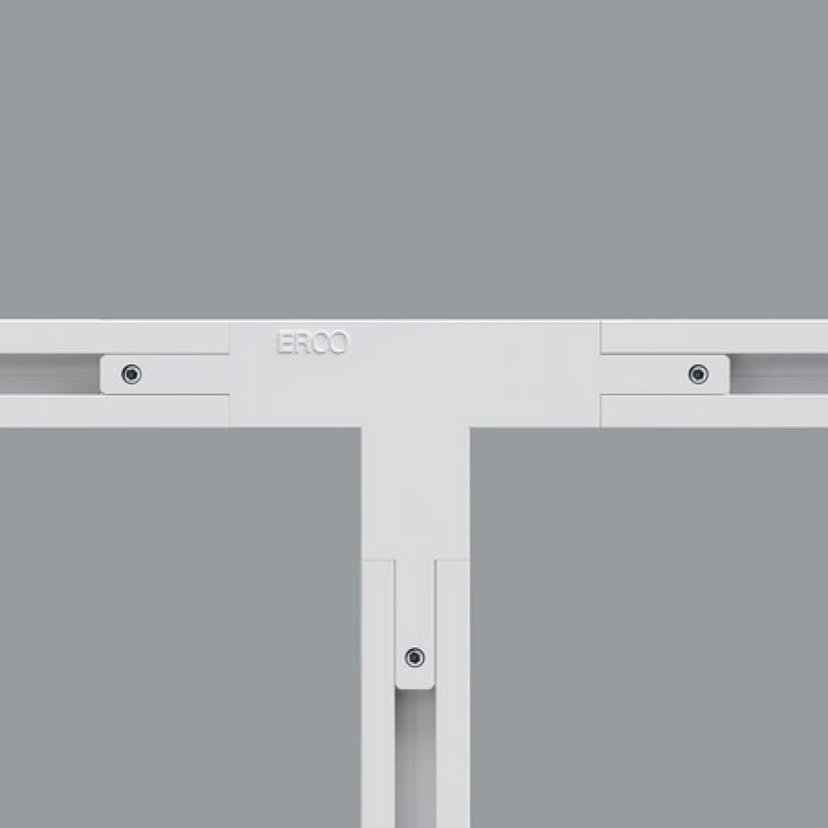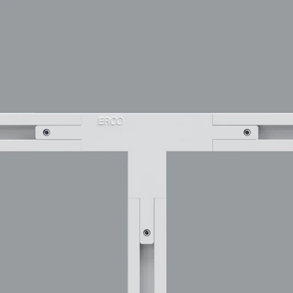 Dieser Verbinder mit Kunststoffgehäuse ermöglicht die Koppelung von drei Minirail-Stromschienen von ERCO mit einem Zwischenstück von 8 cm in gerader und 5,1 cm in rechtwinkliger Richtung. Einspeisung möglich, Durchverdrahtung.