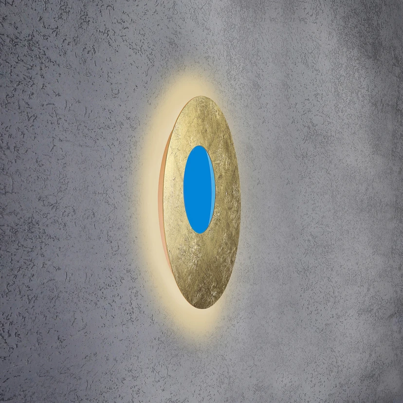 Die Wandleuchte Blade Open RGB von Escale wird in jeder modernen Einrichtung zu einem Highlight - optisch wie funktional. Sie kann dank des verbauten Casambi Bluetooth-Moduls über die passende App für Smartphone und Tablet gesteuert werden, sowohl hinsichtlich des Lichtoutputs als auch der Farbe im Bereich der RGB-LEDs. Die Leuchte überzeugt mit blendfreiem, indirektem Licht mittels rückseitig integrierter LEDs. Primär erzeugen warmweiß strahlende Dioden einen diffusen Lichthof an der Wand rings um die Leuchte. Die flache, runde Aluminium-Scheibe in hochwertigem, strukturiertem Blattgold ist leicht dezentral mit einer kreisförmigen Öffnung versehen; hier sorgen die RGB-LEDs für einen stimmungsvollen bunten Akzent.