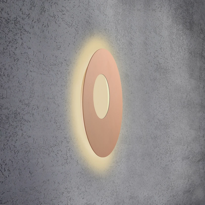 Letzteres wird durch den Aufbau erreicht; die warmweißen LEDs sind rückseitig integriert und erhellen die Wand. Von hier wird das Licht über zwei Bereiche in den Raum reflektiert. Zum einen entsteht ein diffuser Lichthof im Umkreis der der Wandleuchte; zum anderen gibt ein leicht dezentral angeordneter, kreisrunder Ausschnitt innerhalb der flachen, runden Aluminiumscheibe die hell erleuchtete Wand preis.