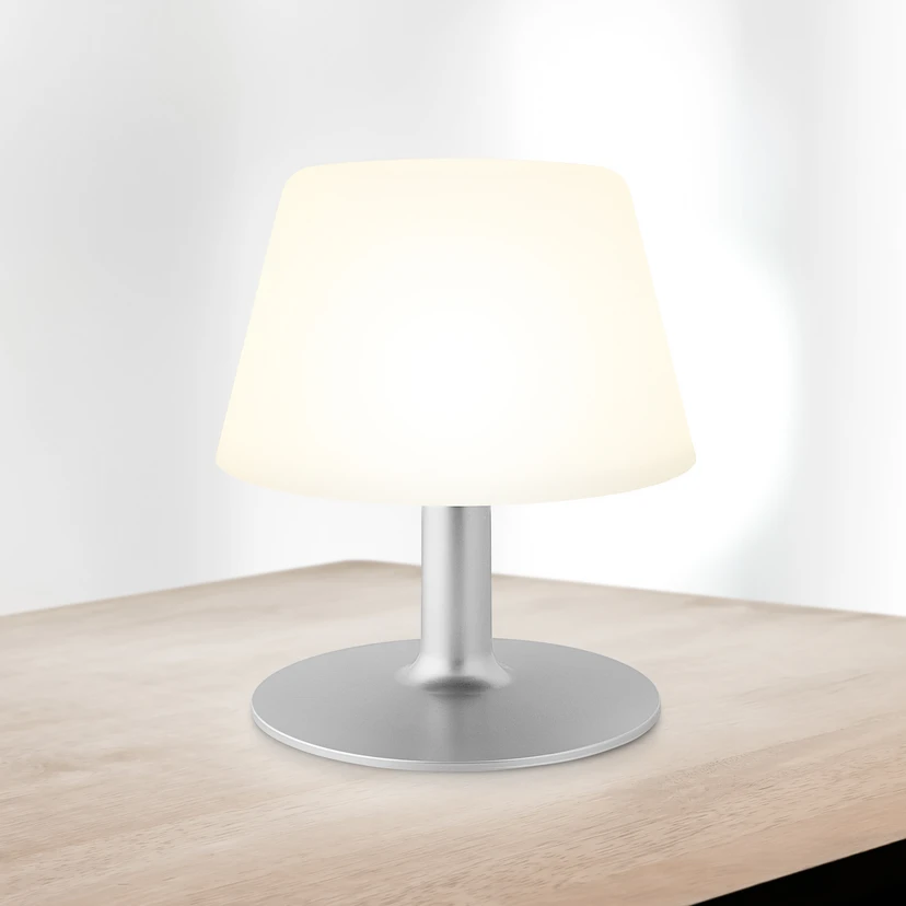 Aus einem Fuß aus silbern lackiertem Stahl und einem Schirm aus opalweißem Kunststoff setzt sich die LED-Solar-Tischleuchte SunLight zusammen. Sie ist sowohl staubdicht als auch gegen Strahlwasser geschützt und wird so zur dekorativen Lichtquelle auf der Terrasse oder dem Balkon. Da ein Solarpanel und Akkus integriert sind, lässt sie sich ohne zusätzliche Stromquelle nutzen.
