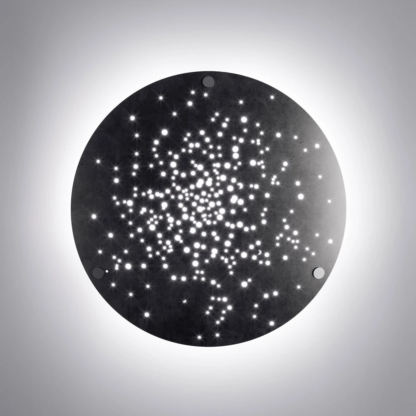 Das Licht des LED-Strips fällt auf einen linsenförmig konvex gebogenen Schirm und durch dessen unregelmäßig angeordnete, unterschiedlich große runde Öffnungen in den Raum. Die Gestaltung mag an ein antikes Schutzschild oder den nächtlichen Sternenhimmel erinnern - der Fantasie des Betrachters setzt Lens keine Grenzen.