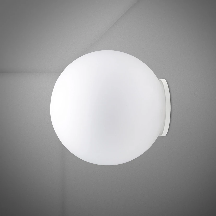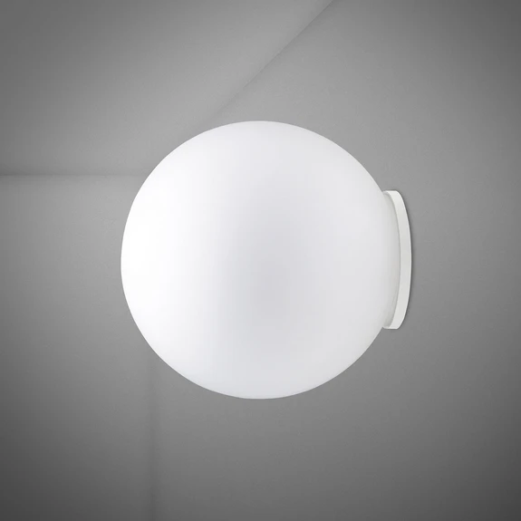 Die von Fabbian in Italien hergestellte Wand- und Deckenleuchte Lumi Sfera eignet sich je nach Lichtoutput der eingesetzten E27-Lampe als Lichtakzent oder rundum leuchtende Lichtquelle. Der Schirm ist eine Sphäre aus weißem Glas, das gleichmäßig und blendfrei erstrahlt. Er wird von einem Halter aus weiß lackiertem Metall getragen.