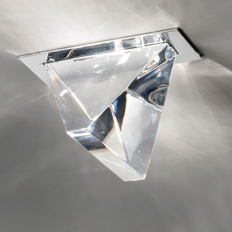 Das Kristallglas, das der LED-Deckeneinbauleuchte Tripla als Lampenschirm dient, ist mehrkantig gestaltet, so dass es wie ein großer geschliffener Kristall wirkt. Wie ein Kristall bricht dieser Glaskörper auch das Licht, wodurch wunderschöne Lichteffekte im Raum entstehen, die sich vor allem an der Zimmerdecke abzeichnen. Tripla wird teilweise in die Decke eingebaut, ragt aber mit dem Glaskörper auch in den Raum hinein und ist somit weder eindeutig als klassische Einbauleuchte noch als konventionelle Deckenleuchte zu bezeichnen.