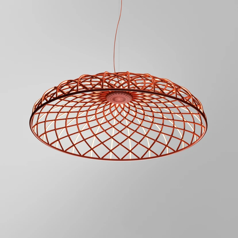 Passend zur Farbe des Schirms ist auch der Baldachin entsprechend lackiert. Zudem sorgt ein spezielles System in der Aufhängung des Schirms für die nötige Balance. Skynest wurde für FLOS vom niederländischen Designer Marcel Wanders erschaffen und zieht auch in ausgeschaltetem Zustand die Blicke auf sich.