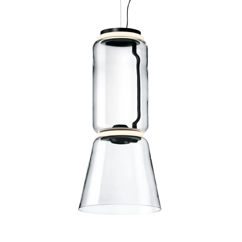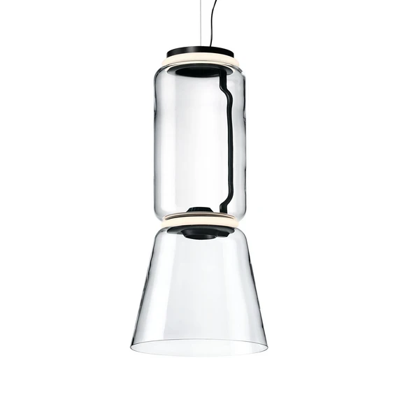 Die einzelnen Glasbausteine sind mundgeblasen und transparent gestaltet. Die Basis der Hängeleuchte bilden zylindrische Gläser, die am unteren Ende von einem kegelförmigen Glaselement ergänzt werden. Es entsteht ein modernes Lichtobjekt, das mit exzellent kalibrierter LED-Beleuchtung verschmilzt. Die Hängeleuchte strahlt im eingeschalteten Zustand warmweißes Licht in den Raum und setzt somit gekonnt Akzente. Sowohl im Wohnbereich wie auch in großzügigen Eingangsbereichen kommt Noctambule sehr gut zur Geltung. Die Verwendung in Hotel- und Gastronomiebereichen kann ebenso beeindruckende Beleuchtung erzielen.
