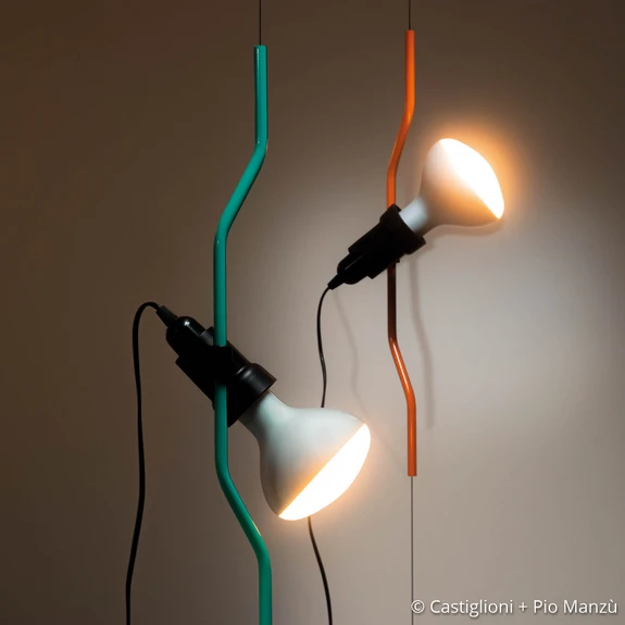 Die Hängeleuchte Parentesi 50 wird durch ihr außergewöhnliches Design zu einem attraktiven Blickfang im Wohnbereich. Die Abhängung besteht aus einem 4 Meter langen Stahlseil, das von der Decke bis kurz über den Boden reicht. An dem farbig lackiertem und geformten Stahlrohr in der Mitte der Abhängung ist die Lichtquelle angebracht, die über einen Schalter verfügt. Das Rohr kann je nach Bedürfnis in der Höhe verstellt werden, außerdem ist ein Dimmer am Kabel integriert. Somit lassen sich die Lichtverhältnisse ganz auf die individuellen Bedürfnisse und Raumgegebenheiten einstellen.
