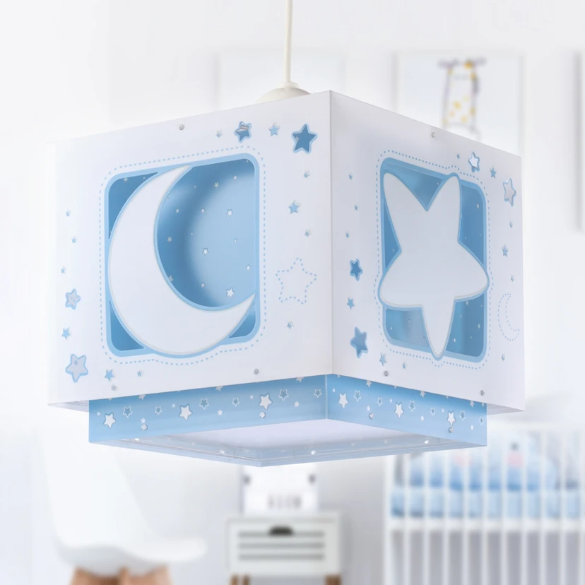 Zum Träumen lädt diese Hängeleuchte mit Sternen und Mond-Motiv ein. Eine fluoreszierende Umrandung sorgt dafür, dass die Motive auch im Dunkeln leuchten! Hergestellt in Europa.