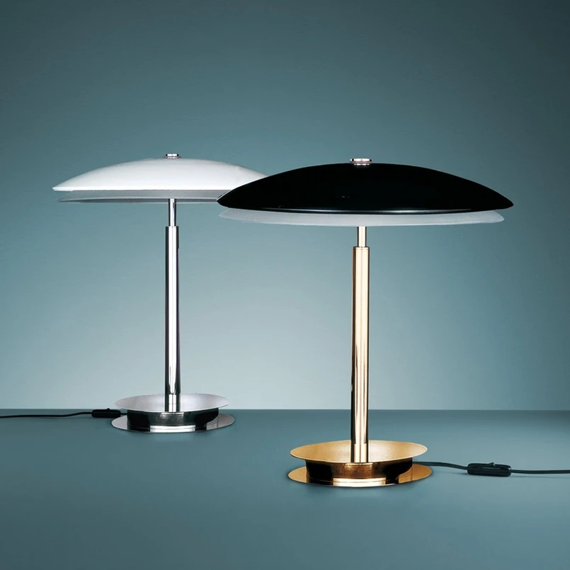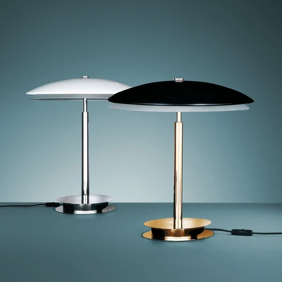 Im Mittelpunkt der Tischleuchte 2280 stehen weder der Aufbau aus Standfuß und Leuchtschirm, noch die besonders offen gestaltete Form der Leuchte selbst. Was auf Anhieb wirkt hat mit dem Effekt zu tun, der sich durch die zweiteilige Gestalt des Leuchtschirms ergibt. Die obere Platte ist aus Metall gefertigt, das in Schwarz oder Silber gefrostet wurde. Diese beiden Variationen sind wählbar. Beim Erstgenannten ist der Standfuß messingfarbig gestaltet, bei Letzterem in zeitlos elegantem Silber gehalten. Die nüchterne Gestalt wird auch durch die eher kompakte Höhe von 43cm und dem Durchmesser von 38cm deutlich. Ein äußerst breiter Lampenschirm sorgt für helles, tiefgehendes Licht im ganzen Raum. Eingesetzt wird ein Leuchtmittel der Fassung E14 mit vier mal 40 Watt. Archivio Storico hat als Designer die nüchterne Eleganz von Glas und Metall verbunden, die durch den Kontrast einer starken Leuchtkraft noch verstärkt wird.