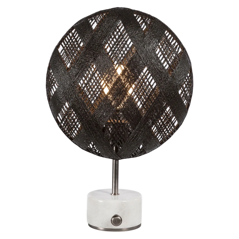 Kreisrund ist der Schirm der Tischleuchte Chanpen und sieht damit einem Vollmond, was "Chanpen" übersetzt bedeutet, nicht ganz unähnlich. Bespannt ist der Schirm mit Fasern des Bananenhanfs, auch Abacá genannt. Die diagonal verlaufenden Fasern ergeben ein Rautenmuster, das an den Schliff von Diamanten erinnert. Chanpen kann mittels des im Fuß integrierten Drehdimmers gedimmt werden.