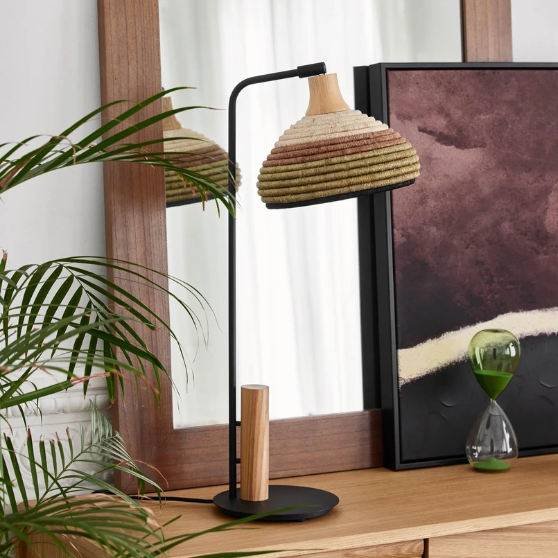Auf einem schwarzen Metallgestell mit zierendem Holzdetail sitzt der besondere, von Hand gefertigte Schirm der Tischleuchte Grass. Dieser Schirm wurde von Hand geflochten und besteht aus Abacá, einer Pflanzenfaser, die aus dem inneren Teil des Abacá-Baumes besteht und für eine hohe Zugfestigkeit und Langlebigkeit bekannt ist, weswegen diese Faser beispielsweise auch zur Herstellung von Schiffstauen verwendet wird. Weiterer Bestandteil des Schirms ist Raffia, eine Faser, die von Hand aus dem ungeöffneten Blatt der afrikanischen Raffiapalme, auch Buripalme genannt, gewonnen wird. Warme Farbkombinationen im Streifendesign machen die Tischleuchte zu einem Lichtspender, der Behaglichkeit und Natürlichkeit in jeden Raum bringt.
