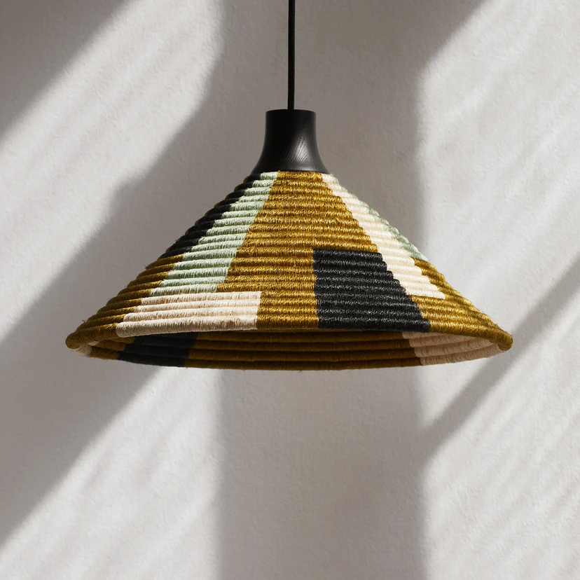 Der Schirm der Pendelleuchte Parrot S wird durch seine außergewöhnliche Gestaltung und Farbgebung zu einem Blickfang im Wohnbereich. Er besteht aus Rattan und Abacá und setzt sich aus übereinanderliegenden, schmalen Seilen zusammen. Das Textilkabel und der metallene Baldachin wurden schwarz gestaltet. Entworfen wurde die Hängeleuchte von der Produktdesignerin Jette Scheib, die von der Vielfalt und dem kulturellem Einfluss der Gestaltung von Körben fasziniert war. Die Leuchtenserie Parrot soll die farbenfrohe und ausdrucksstarke Seite der Korbkultur unterstreichen.