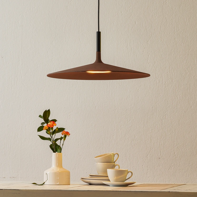 Das Material, welches für den Schirm der LED-Hängeleuchte Aplomb large verwendet wird, ist eher ungewöhnlich. Beton, der normalerweise schwer und rau daherkommt, wird hier für eine elegante, leicht wirkende Leuchte verwendet. Möglich macht dies das aufwändige Herstellungsverfahren. Gefertigt wird Aplomb mit handwerklichem Geschick von italienischen Experten für Zementverarbeitung. Die größte Herausforderung hierbei besteht darin, eine geringe Materialstärke zu erschaffen. Dies wird ermöglicht durch eine spezielle Mischung, die beim Guss besonders flüssig bleibt und so behutsam in Form gegossen werden kann. Durch die zugemischten Farbpigmente wird das natürliche Grau des Materials überdeckt, ohne aber die Haptik und die Rauheit zu verändern.