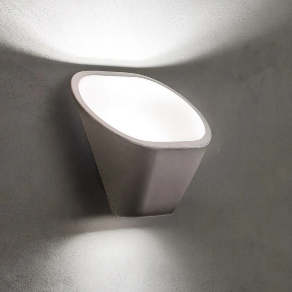 Die kegelförmige Wandleuchte Aplomb besteht aus Beton und wird aus einem speziellen, mit Farbpigmenten versetzten Gemisch im flüssigen Zustand in Form gegossen. Das sonst so graue Wesen des Betons wird hier geschickt mit Farben neu interpretiert und schafft so auch den Sprung von der Welt des Bauwesens, in dem das Material sonst seine Anwendung findet, hin zum Einsatz als dekorative Leuchte. Da das Material das Licht sonst völlig abschirmen würde, ist die Form der Wandleuchte Aplomb so gearbeitet, dass es eine sehr breite Öffnung nach oben und eine schmalere nach unten gibt. Die Oberseite sorgt für ein ausreichend helles Licht, welches von der Wand sowie von der Decke reflektiert wird. Das Licht aus der schmalen Öffnung nach unten bildet einen raffinierten Lichtkegel, der für einen dekorativen Effekt sorgt.
