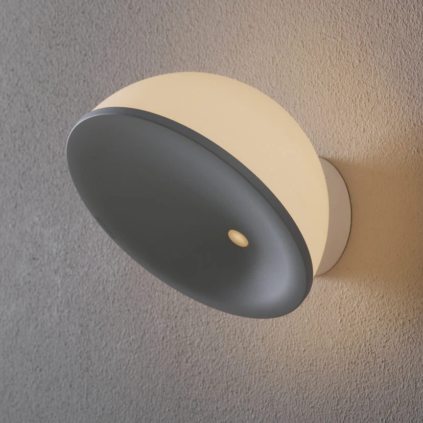 Ein halbkugelförmiger Diffusor aus transluzentem Polycarbonat wird von einer Aluminiumscheibe bedeckt, die lediglich von einem kleinen, dezentral platzierten Löchlein unterbrochen wird. Im Inneren des Leuchtenkörpers sitzt die LED-Lichtquelle, deren warmweißes Licht sich durch den großen Diffusor großflächig im Umkreis der Leuchte ausbreitet. Währenddessen tritt durch die Öffnung in der Abdeckung ein gebündelter Lichtschein nach außen, der einen zusätzlichen Akzent setzt und der Beep eine gewisse Dynamik schenkt. So sorgt Beep für ein gleichzeitig gebündeltes wie auch indirektes, weiches Licht, das durch Drehen der Leuchte den Bedürfnissen angepasst werden kann.