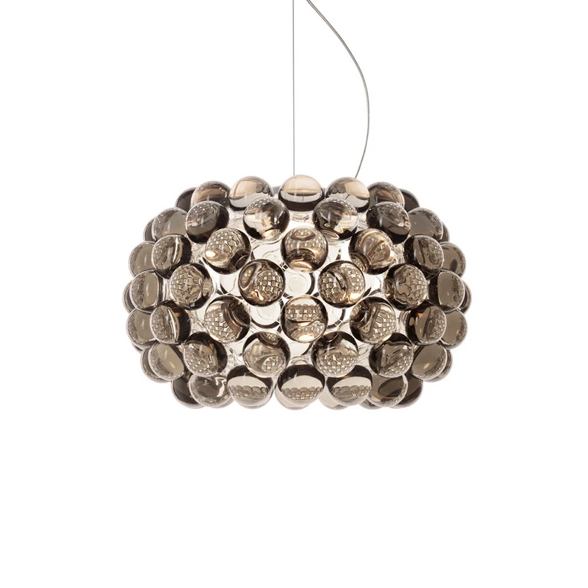 Die kleinste Hängeleuchte aus der Caboche-Leuchtenserie von Foscarini ist wie ihre größeren Geschwister mit einem charakteristischen Lampenschirm ausgestattet, der von zahlreichen durchsichtigen PMMA-Kugeln geziert wird. Diese sind wie Perlen an einem Armband aufgereiht; letzteres diente den beiden Designerinnen Patricia Urquiola und Eliana Gerotto als Inspriationsquelle.