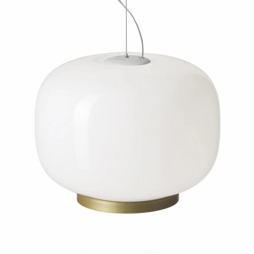 Diffuses Licht zu allen Seiten und direkte Beleuchtung nach unten spendet die LED-Hängeleuchte Chouchin des italienischen Leuchtenherstellers Foscarini. Der Schirm der Leuchte ist aus geblasenem Opalglas hergestellt. In seiner bauchigen Form, die nach unten mit einem Ring in goldener Lackierung besetzt ist, erinnert er an die traditionellen fernöstlichen Lampions aus Papier und Bambus, die in Japan als Leuchtschilder vor Lokalen oder als Glücksbringer vor den Häusern verwendet werden.