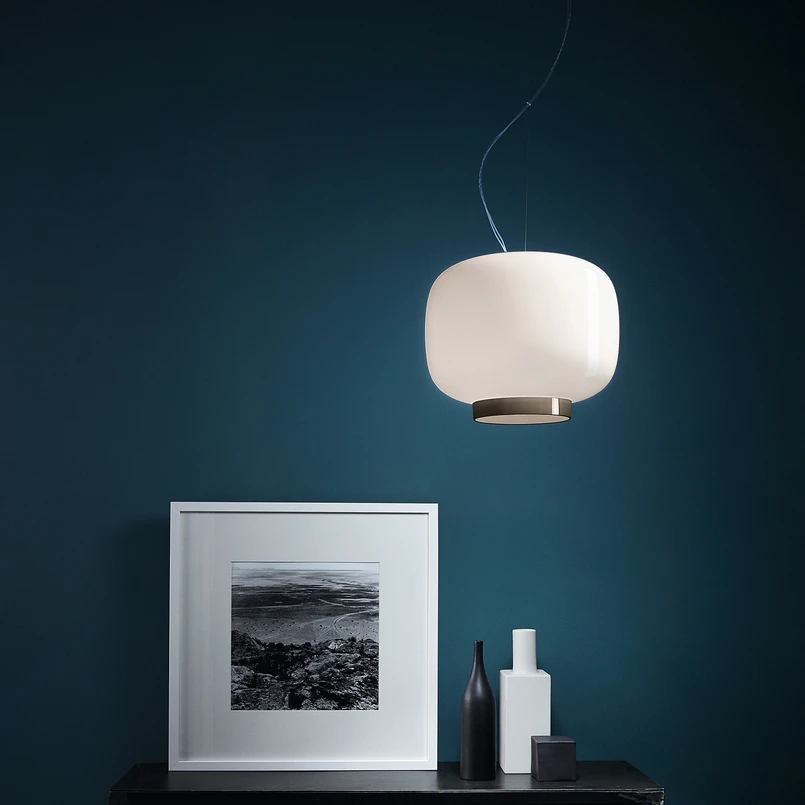 Im Gegensatz zu der klassischen Chouchin-Serie von Foscarini bietet die Chouchin Reverse, wie der Name bereits andeutet, das Design in umgedrehter Farbgebung. Die Leuchtenfamilie, die aus der Feder der französischen Designerin Ionna Vautrin stammt, ist mit einem mundgeblasenem Glasschirm ausgestattet, der in der ursprünglichen Version farblich lackiert und somit lichtundurchlässig ist. Bei der Chouchin Reverse 3 bleibt der Glasschirm weiß satiniert und der kleine Ring auf der Unterseite wird farblich gestaltet. Dies sorgt dafür, dass die LED-Hängeleuchte Chouchin Reverse 3 nicht nur Licht nach unten, sondern auch durch den Schirm diffus in den Raum hinein gibt. Hell und als sehr angenehm wird diese Lichtwirkung empfunden, die gerade in behaglichen Wohnräumen oder auch in Bars und Cafés sehr gut eingesetzt werden kann. Die Form der Chouchin-Serie ist inspiriert von japanischen Lampions, die meist zu mehreren vor Häusern oder Restaurants in Japan eingesetzt werden. Demnach ist auch die Chouchin so konzipiert, dass sie zwar gut einzeln genutzt werden kann, aber gerade im Zusammenspiel als Installation mit den beiden anderen Chouchin-Formen eine beeindruckende Harmonie erzielt.