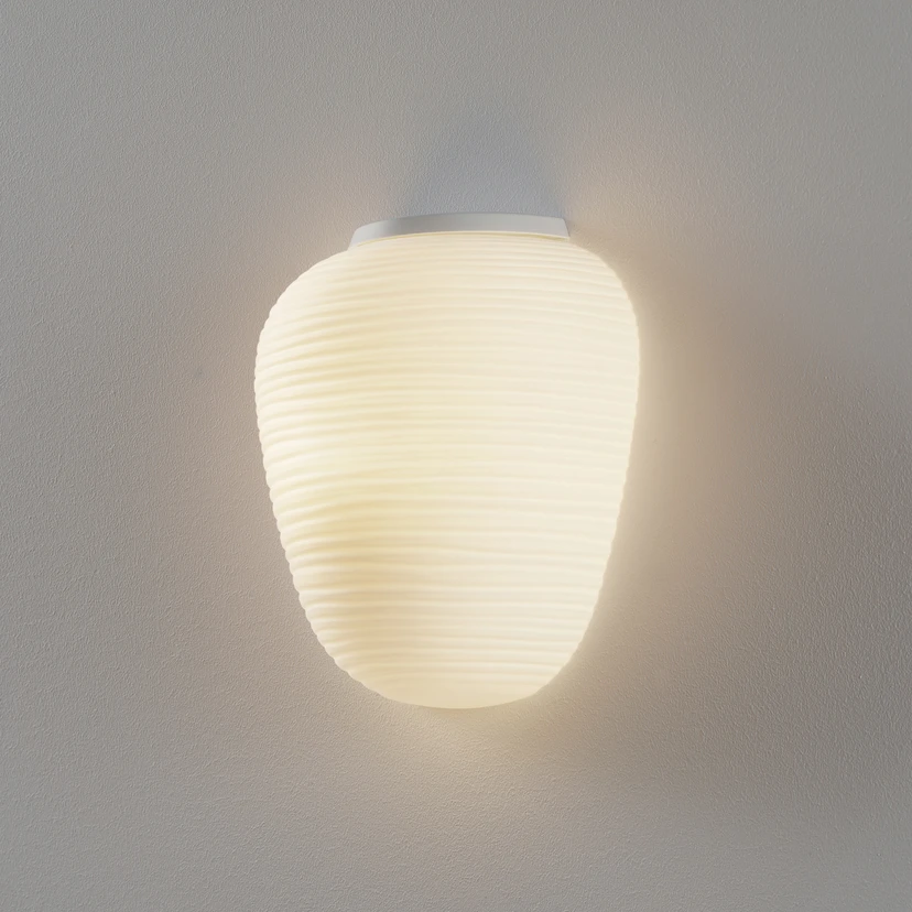 Die Wandleuchte Rituals 3 semi gehört zu einer Leuchtenserie, die mit ihrer zarten Eleganz begeistert und private sowie öffentliche Räumlichkeiten mit einer warmen Atmosphäre erfüllt. Die Leuchte verfügt über einen Schirm aus mundgeblasenem Glas, der mit einer Struktur aus horizontalen Rillen verziert ist. Die reliefartigen Linien sind unterschiedlich dick und unregelmäßig angeordnet. Durch die unterschiedlichen Glasstärken wird das Licht gedämpft und es entstehen unterschiedliche Lichtintensitäten. Mit der weißen Farbe des Glases und dem filigranen Relief wirkt die Leuchte fast wie eine Laterne aus feinem Reispapier.