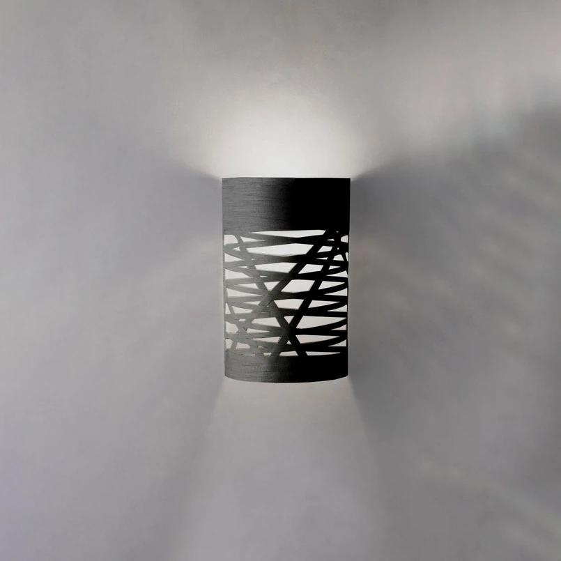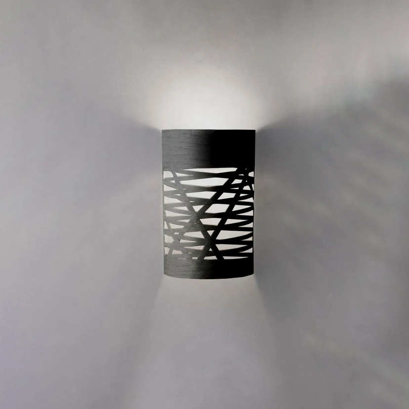 Das charakteristische Merkmal, das sich durch alle Produkte der Tress-Familie von Foscarini zieht, ist die geflochtene Struktur des Lampenschirms. So ist auch der halbrunde Schirm der Wandleuchte Tress aus hochwertigem Glasfaser-Verbundmaterial gefertigt, das in Form eines schmalen Bandes per Hand so um einen sich drehenden Zylinder gewickelt wird, dass ein kunstvolles Flechtwerk entsteht. Einzelne, schräg von oben nach unten oder von unten nach oben verlaufende Bänder durchbrechen den sonst recht symmetrischen, horizontalen Verlauf und lassen unterschiedlich geformte Lichtauslässe entstehen.