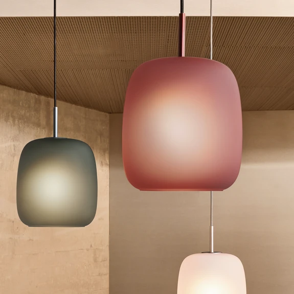 Die Pendelleuchte der Designerin Fumie Shibata, die im Jahr 2021 auf den Markt kam, wirkt in ein- und ausgeschaltetem Zustand als Eyecatcher im Raum, da sie stets die Farbe behält. Der Schirm besteht aus mundgeblasenem Milchglas, das in weichen Kurven zu einem dekorativen Schirm geformt wurde, der das Licht der eingesetzten Lampe rundherum diffus in den Raum treten lässt und zudem durch das nach unten offene Glas direkt und funktional abgibt. Maluma™ ist nur ein Beispiel für die zurückhaltende Gelassenheit der Designs von Fumie Shibata, die Form und Funktion auf eine Art miteinander verbinden, die sich fast unbemerkt in den Alltag integriert.