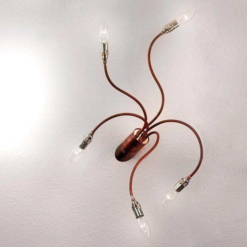 Modern und außergewöhnlich wirkt die fünfflammige Decken- oder Wandleuchte Brazona, deren fünf Leuchtenarme bei der Montage durch Biegen in verschiedene Positionen gebracht werden können. So lässt sich eine ganz individuelle Leuchtenkreation realisieren. Bei gestreckten Armen beträgt die Höhe der Leuchte 60 cm. In die E14-Leuchtenfassungen aus Messing lassen sich Glühlampen, Energiesparlampen oder moderne LED-Leuchtmittel einsetzen. Die interessant gestaltete Decken- oder Wandleuchte Brazona wirkt durch den Verzicht auf Leuchtenschirme und die außergewöhnliche Gestaltung sehr extravagant und stellt einen Blickfang im Raum dar, egal, ob an der Decke oder an der Wand montiert.