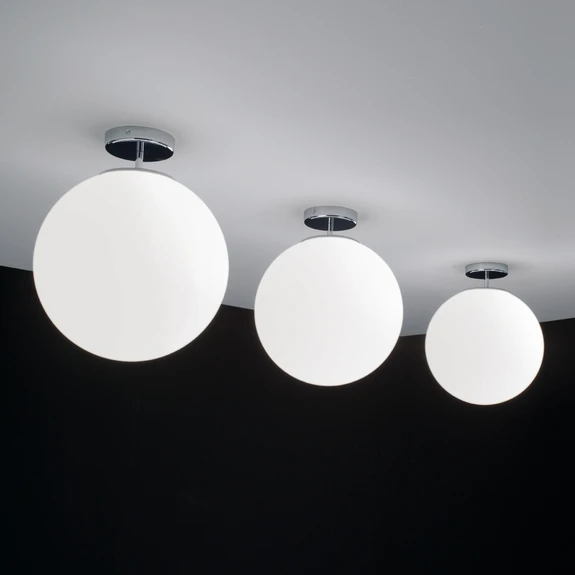 Die Deckenleuchte Sferis verteilt über einen Durchmesser von 30 cm die volle Leuchtkraft eines bis zu 100 Watt starken Leuchtmittels im Raum. Einsetzbar sind Energiespar- sowie LED-Leuchtmittel. Der opalweiße Schirm ist kugelrund und nur über eine minimale Strebe mit der Deckenhalterung verbunden. Ein zeitlos elegantes, überall integrierbares Design für Zuhause.
